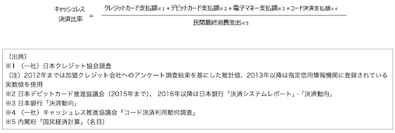 まず、キャッシュレス決済比率の定義ですが、クレジットカード、デビッドカード、電子マネー、QRコード決済による支払いの合計額を民間最終消費支出で割ることによって求められています。