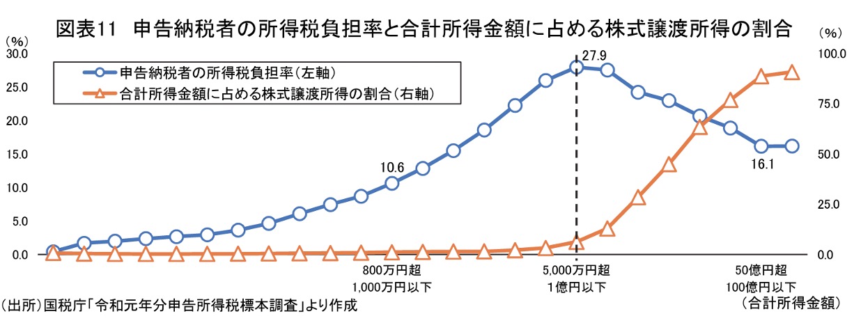 「1億円の壁」とは、年間所得が1億円を超えるあたりを境に、所得税の実効税率(所得に対する税負担の割合)が低下する現象を指します。