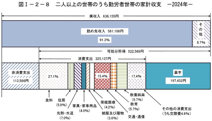 ちなみに消費支出以外の支出として税金と社会保険料を合計した非消費支出が定義されています。収入から非消費支出(税金+社会保険料)を引いたものが可処分所得と呼ばれます。家計調査の結果から、「二人以上の世帯のうち勤労者世帯」の家計収支は以下のようになっています。