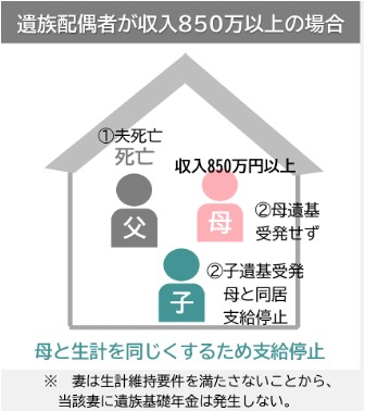 夫が死亡した場合、母と同居でも母の収入が高くて要件を満たさない場合遺族基礎年金は支給されません。