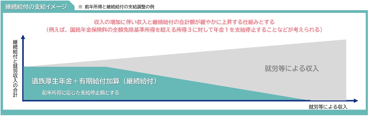 有期給付終了後も様々な事情によって十分な生活の再建に至っておらず、引き続き、遺族厚生年金による生活保障の必要性が高い状況にある者への配慮の観点から、5年間の有期給付終了後も所得等に応じた遺族厚生年金の支給を継続する。