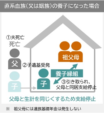 片親の父が死亡した場合、子どもに遺族基礎年金の受給権が発生しますが、祖父母に引き取れれて同居すると支給停止になるとともに、祖父母には遺族基礎年金は発生しません。