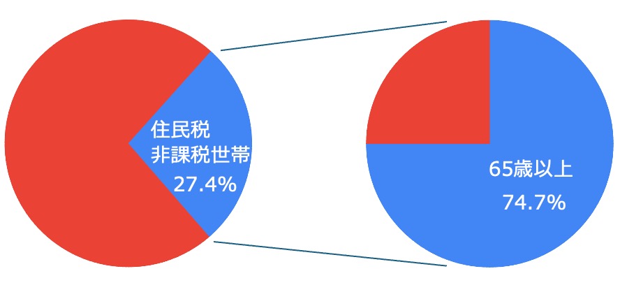 2023年の国民生活基礎調査によると、住民税非課税世帯の全世帯に対する割合は27.4%です。また住民税非課税世帯のうち、74.7%が65歳以上の世帯となっています。