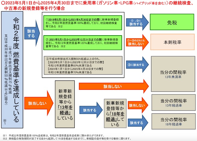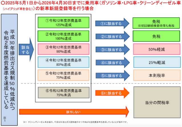 フローチャートは2025年4月30日までと5月1日以降で分かれているので、細かいですが両方のフローチャートを引用して掲載しておきます。2025年4月30日までのフローチャートはガソリン車のものです。
